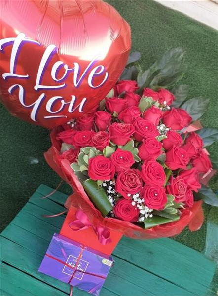 30 long stemmed Red roses handtied in water includes baloon and chocolates