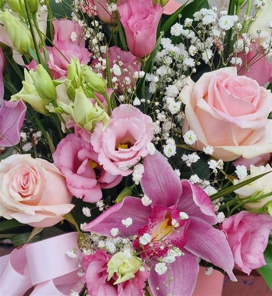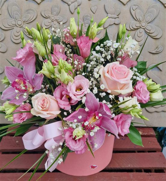 Stunning pink lizzy,roses and orchids arranged in a keepsake hatbox