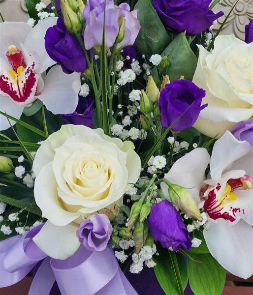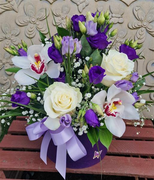 Stunning purple lizzy,white roses and orchids arranged in a stunning keepsake hatbox