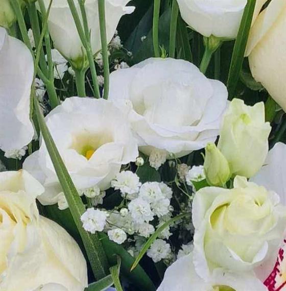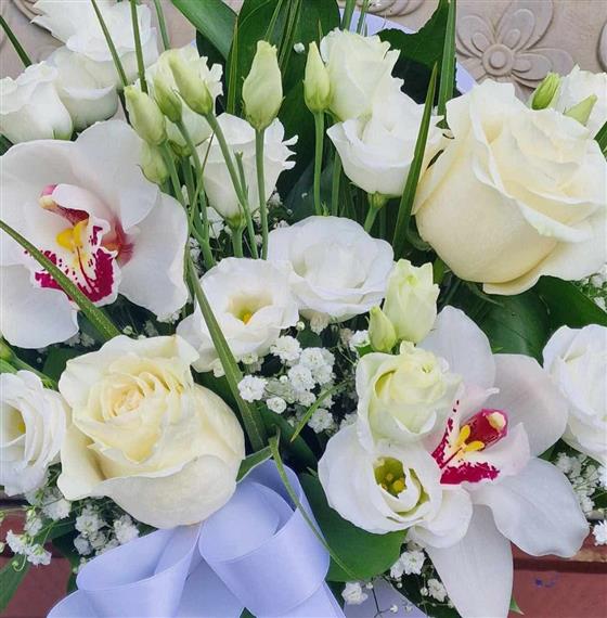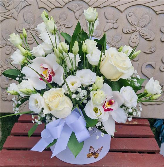 Stunning white lizzy,roses and orchids arranged in a keepsake hatbox