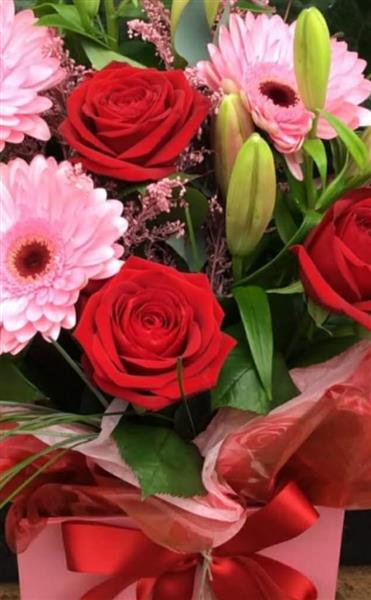 Pink germinis,red roses and la lillies