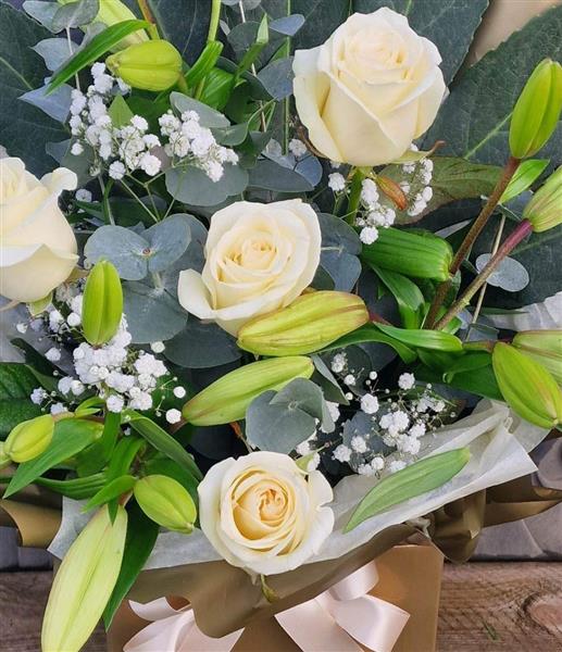 🤍Luxury handtie of long stemmed roses and lillies with ornamental foliage.........no vase required🤍