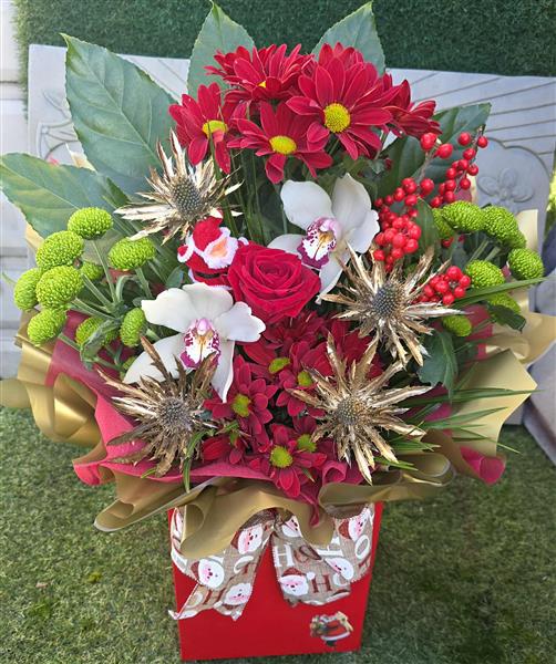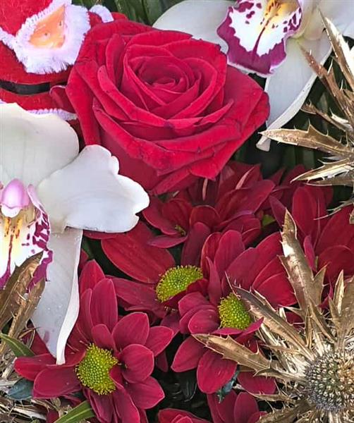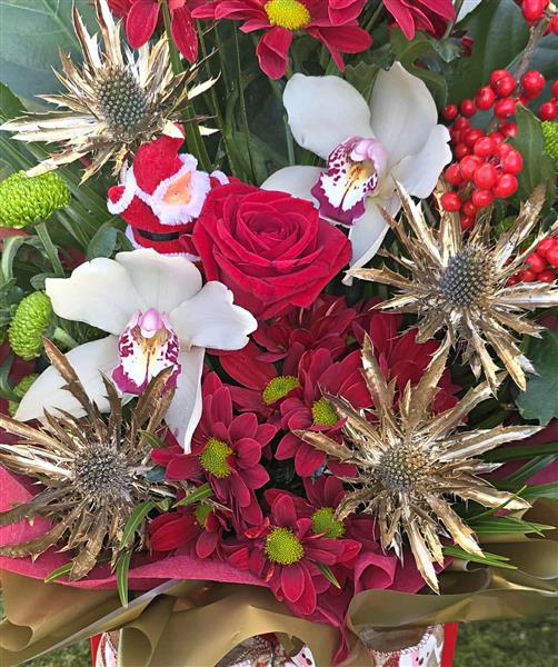 Festive reds golds and whites including roses,orchids,thistles and orchids