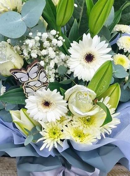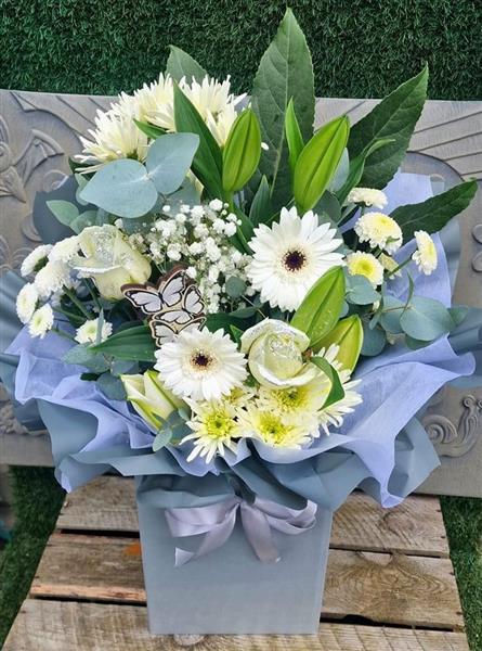 crisp whites and sparkling silvers feature in this luxury handtied in water delivered in a stylish gift box