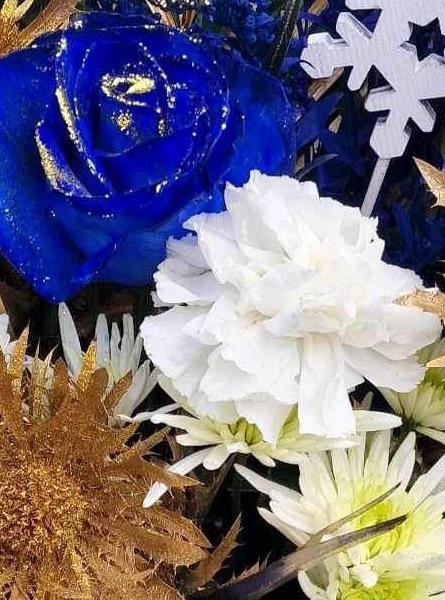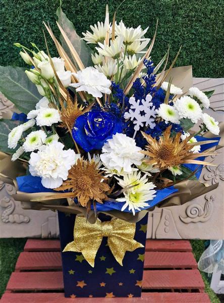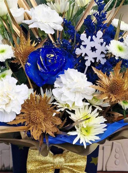 Stunning navy roses,gold thistles and crisp white carnations are included in this gorgeous hand-tied bouquet which is sure to deliver the wow factor this Christmas
