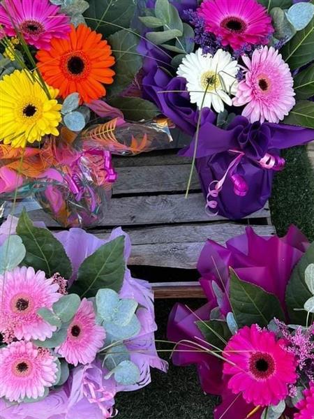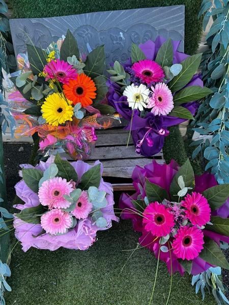 Trio of gerbra with iller and greenery in your choice of colours