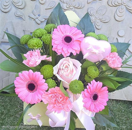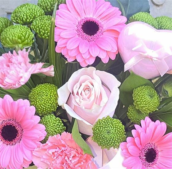 🌸pale pink germinis,pale pink carnations,rose and green pea chrysanthemums arranged in a stylish sage green envelope with a pink heart 🌸